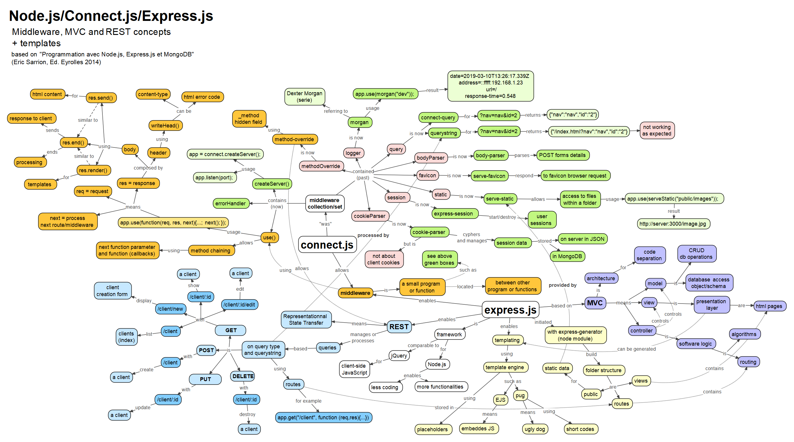 Il s’agit d’un framework très répandu qui fournit plusieurs middlewares (dont cités ci-dessus et beaucoup d’autres) et qui permet d’implémenter la gestion des middleware (avec use() comme pour Connect.js) mais qui implémente “nativement” le concept de REST (Representationnal State Transfer) et a un module spécifique qui permet de construire un environnement de départ, basé sur une architecture MVC.